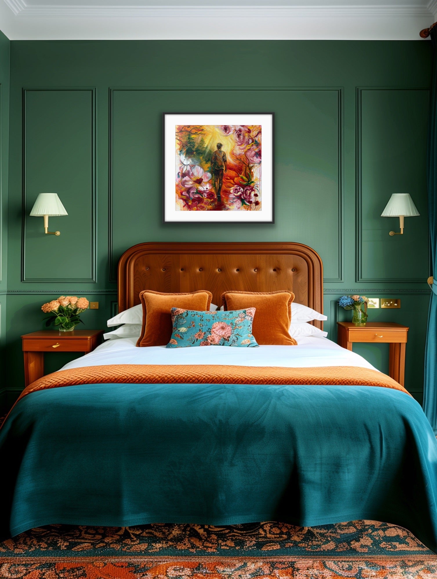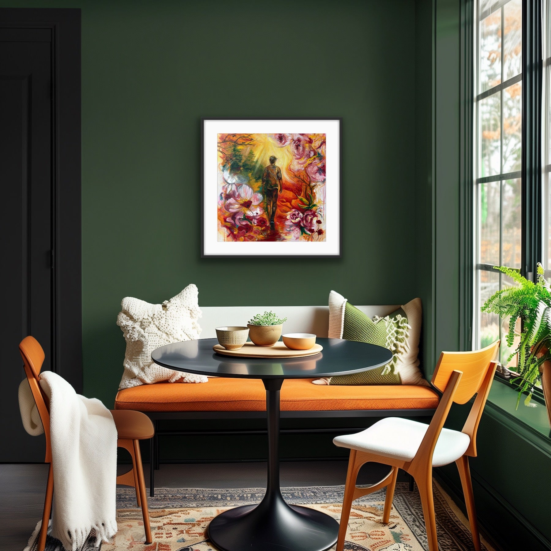 'Awakening–Rhythms of Desire' captures the profound moment when the soul stirs to life, surrounded by an explosion of vibrant florals that dance with passionate energy. This evocative piece explores the delicate balance between contemplation and awakening, as a solitary figure stands amidst a symphony of blooming desires.